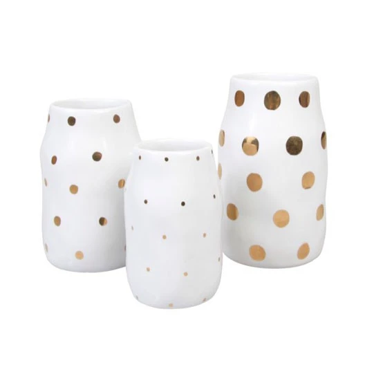 These gold dotted vases are perfect for small flowers. All three vases have a different patterns. By KLEVERING.