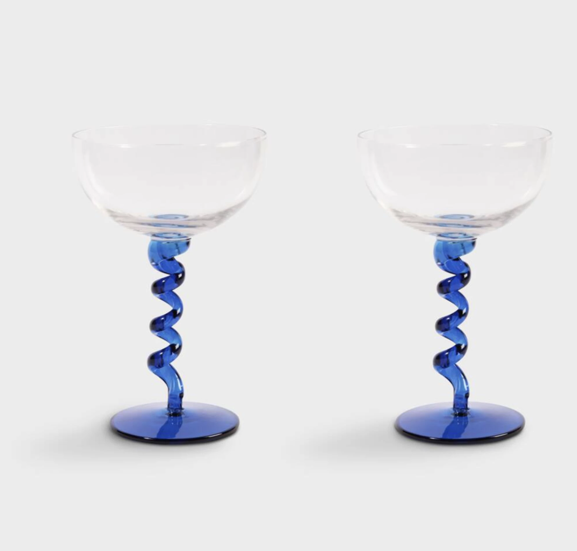 These spiral Champagne/Cocktail Coupe Saucer glass are made from fine glass and have a blue glass stem, perfect for making any important toasts