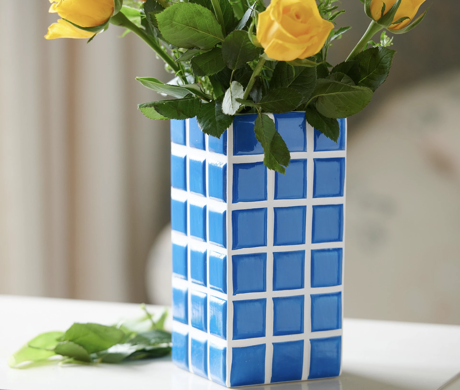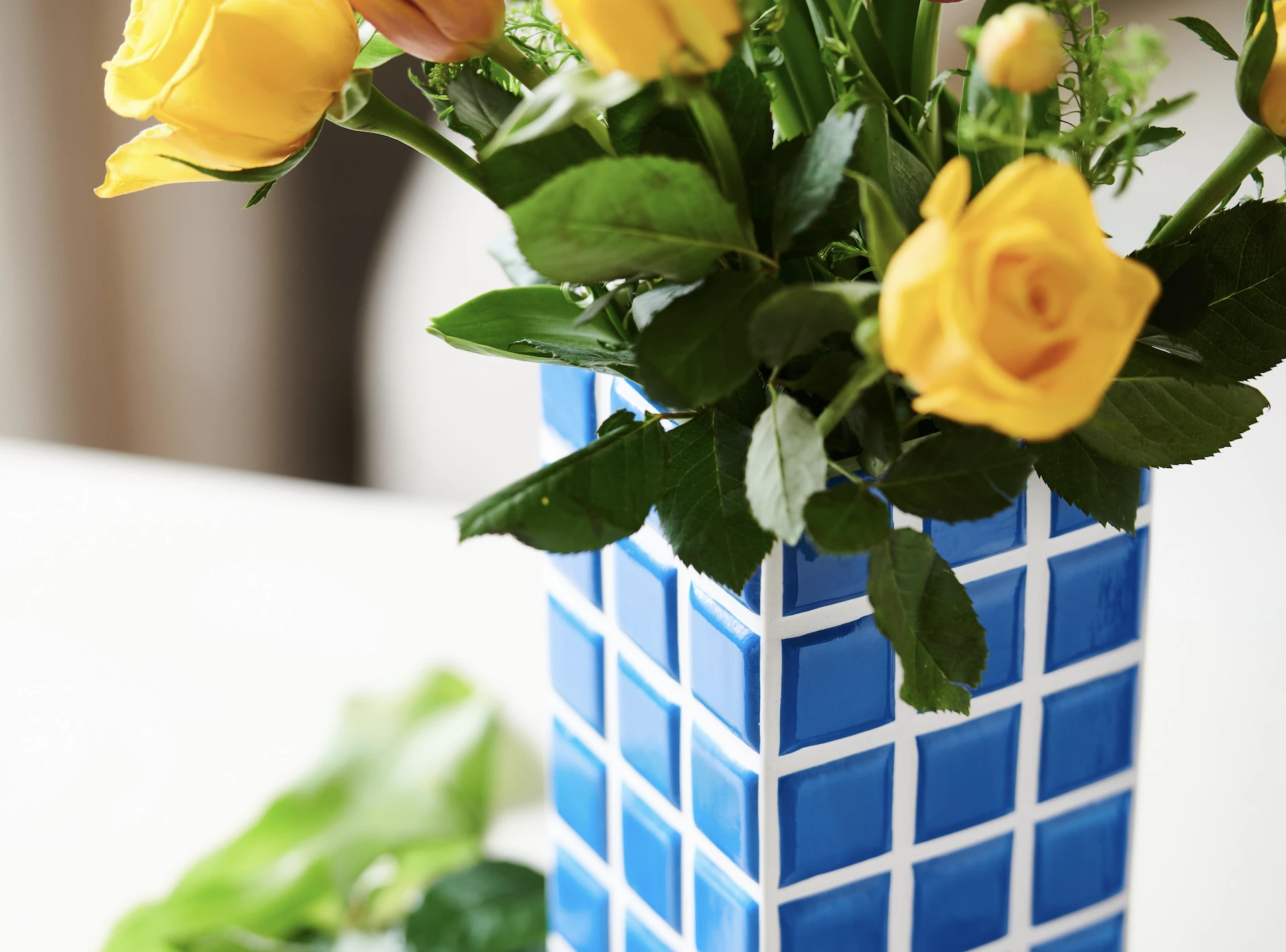 This blue tile vase is a beautiful show stopper that can be used as a vase or planter.