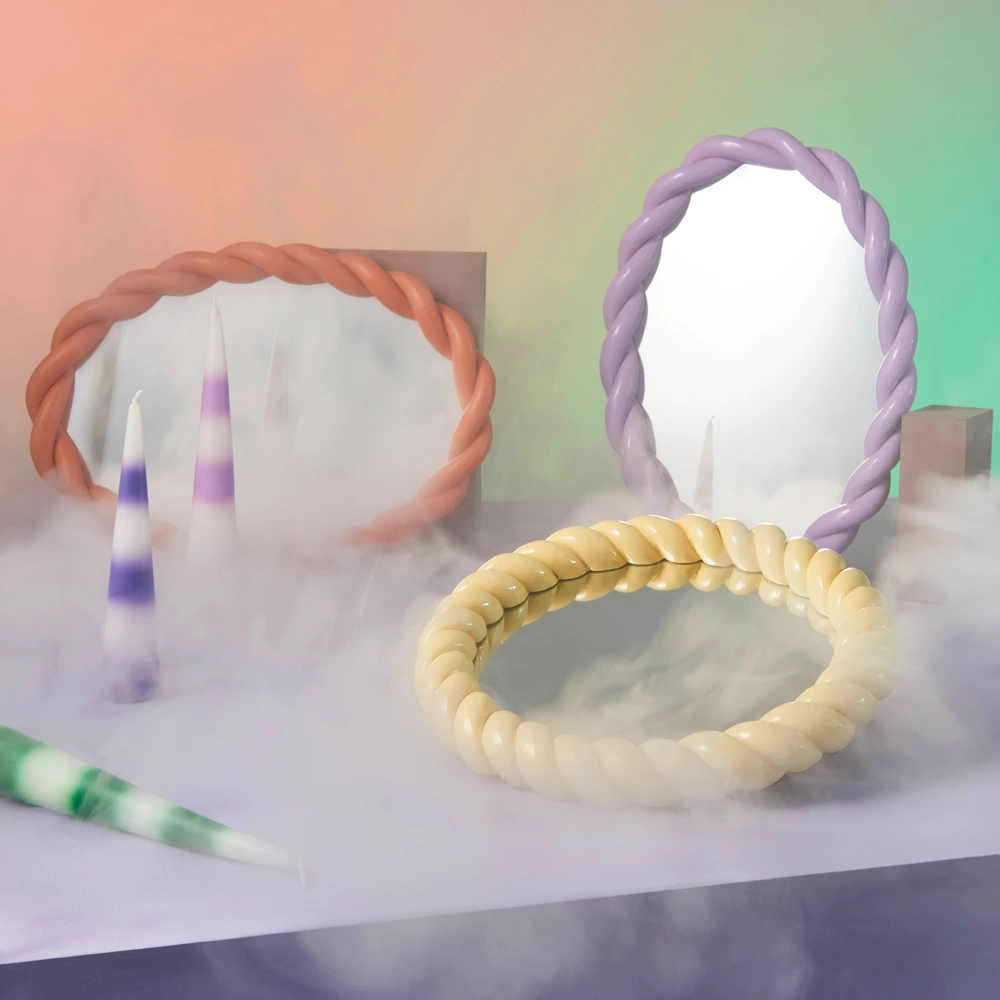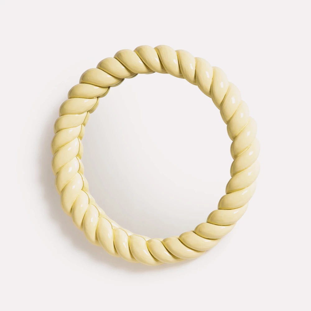 Wall mirror with braid profile in colored polyresin in a bauble design. The softer twisted shape combined with a sweet pastel color gives this mirror a fairy tale look and great decorative eye-catching power. You can mount this mirror using the hook on the back although the screw is not included.