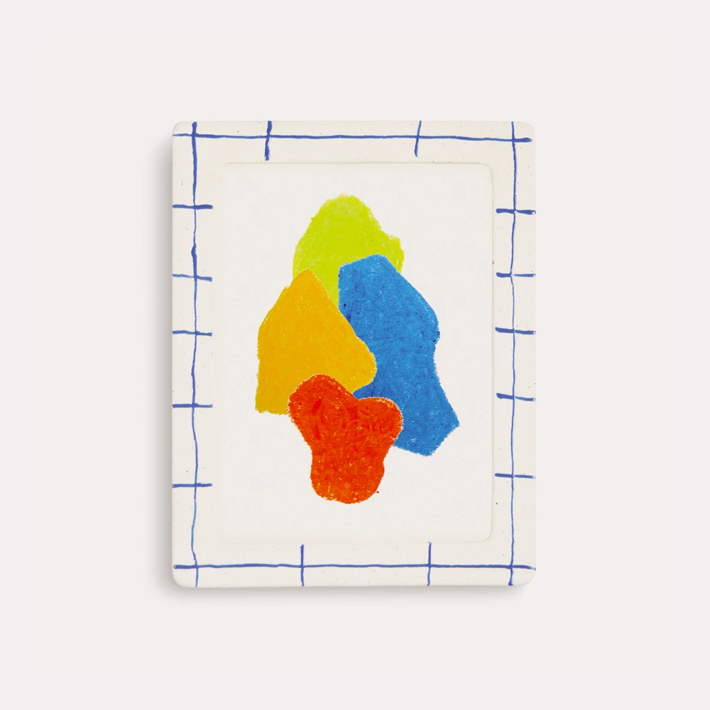 Photo frame made of ceramic with MDF board back. The front frame is enameled in a soft nude color with a glossy finish. The front frame is topped with a rustic texture in a natural color, overlaid with bright blue enameled lines. A stylish and colorful way to frame your most precious memories and keep them always present in your favorite corner.