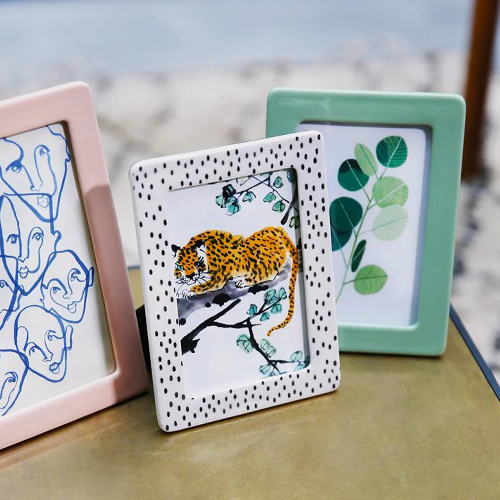 Photo frame made of ceramic with MDF board back. The front frame is enameled in a soft nude color with a glossy finish. A stylish and colorful way to frame your most precious memories and keep them always present in your favorite corner.