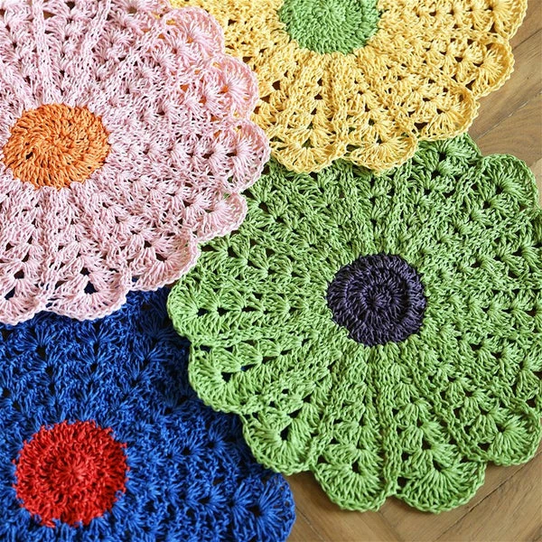 Decorate your table with these daisy placemats. Each have been crocheted in bold tones for a colourful tablescape. Four colours Sold individually Ø 38.5 cm