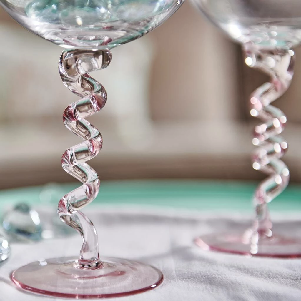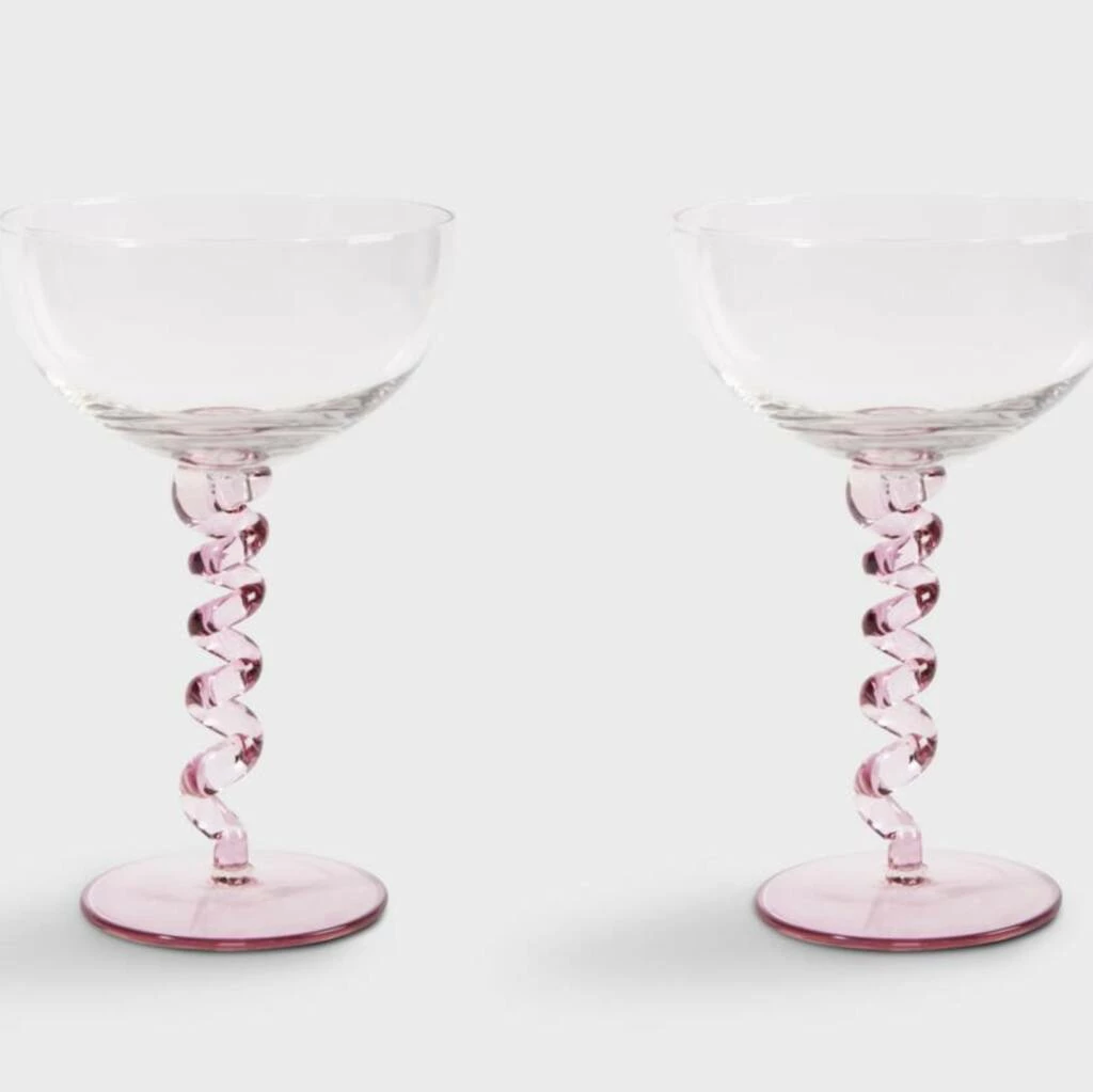 This spiral Champagne/Cocktail Coupe Saucer glass is made from fine glass and has a pink glass stem, perfect for making any important toasts