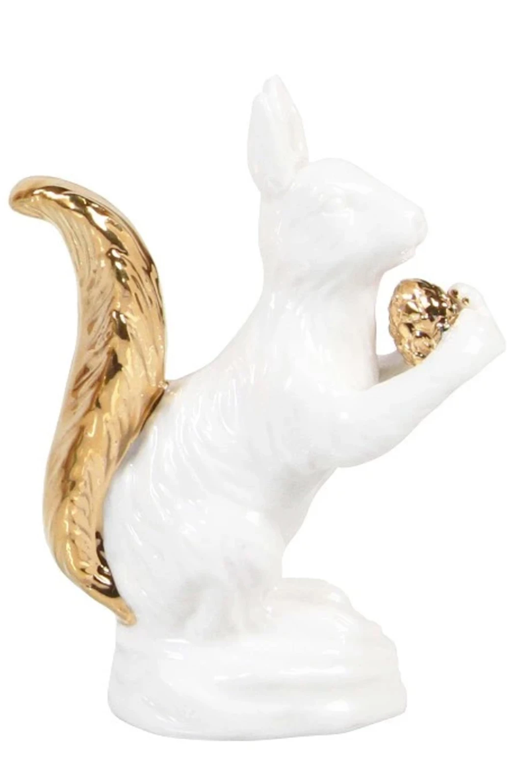 Cute porcelain standing squirrel with a gold tail and holding a gold acorn.