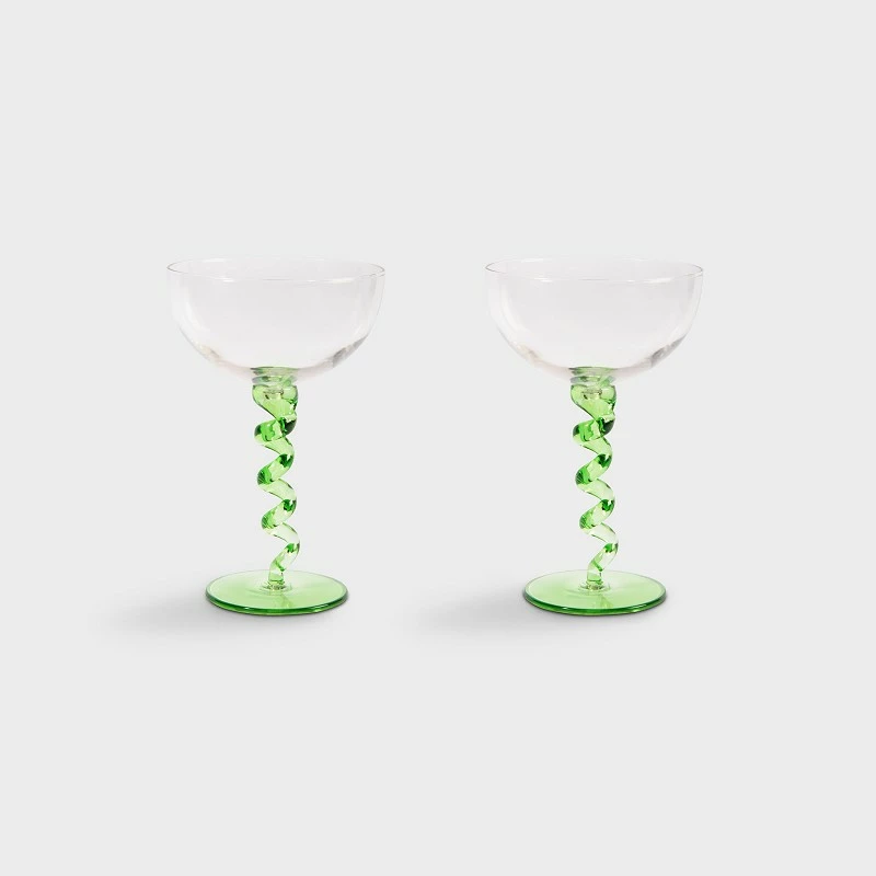 Eat your favourite dessert in these spiral coupes! They are perfect for delicious ice cream or a glass of Prosecco. They look great on any table due to the bright solid green colour and a twisted foot.