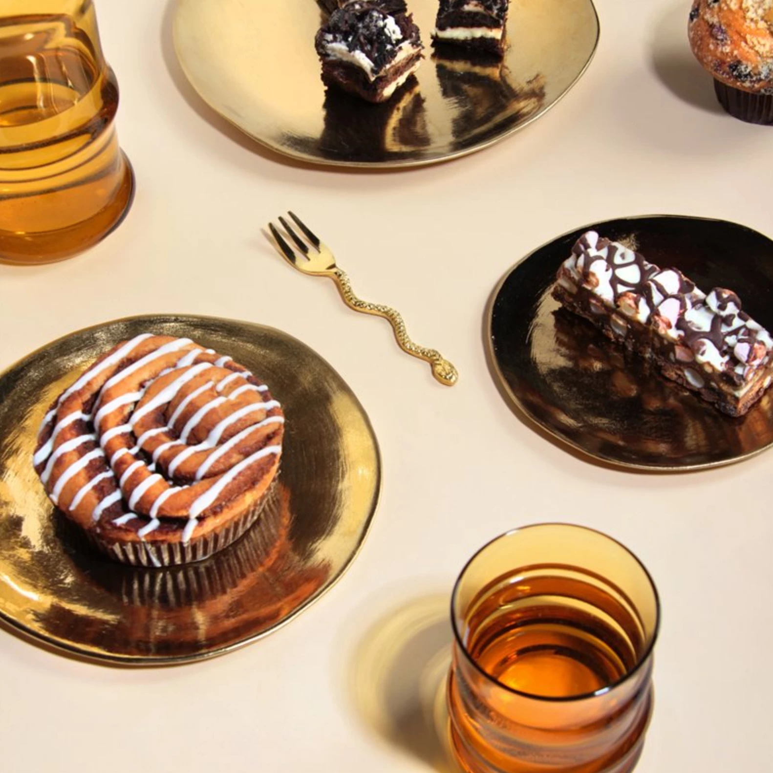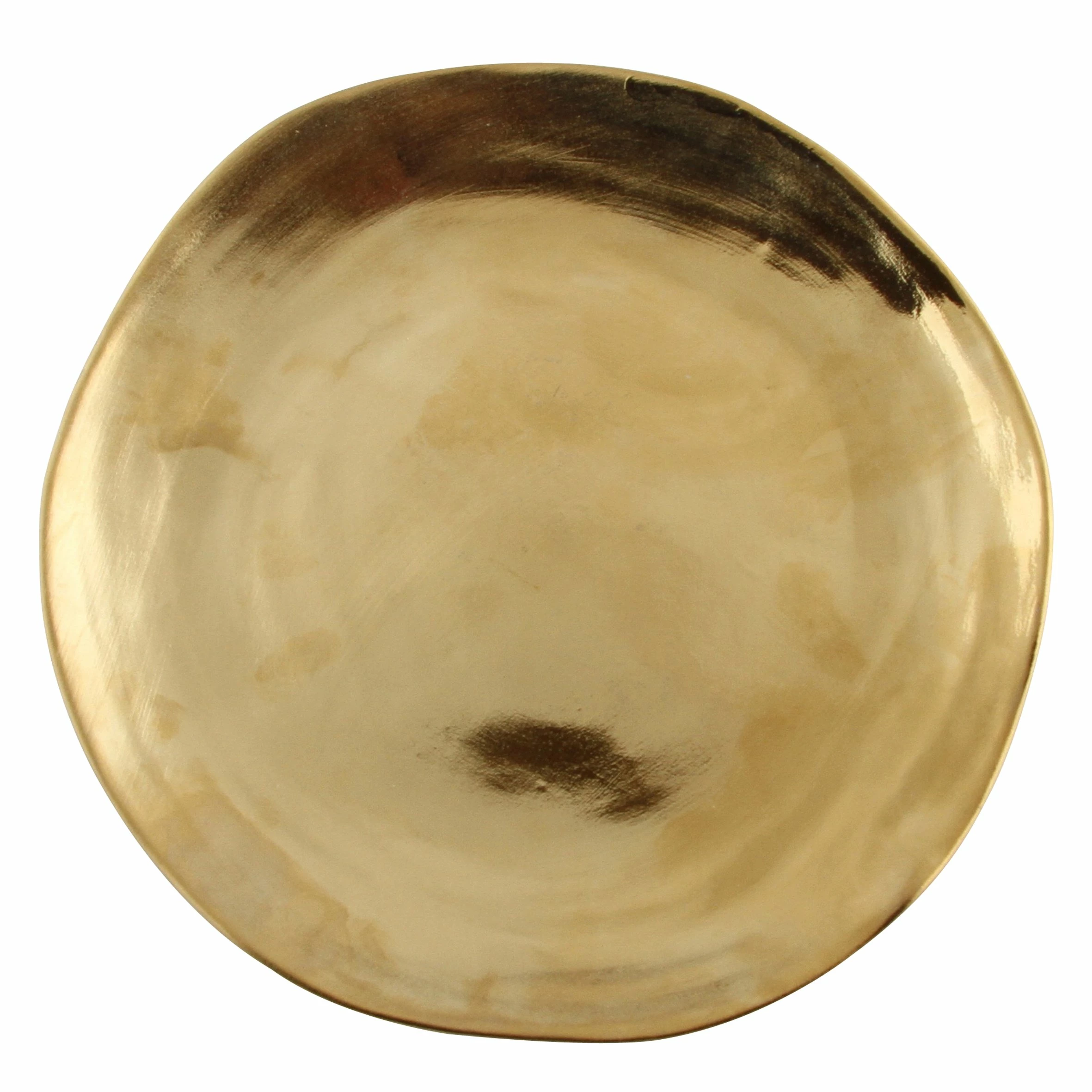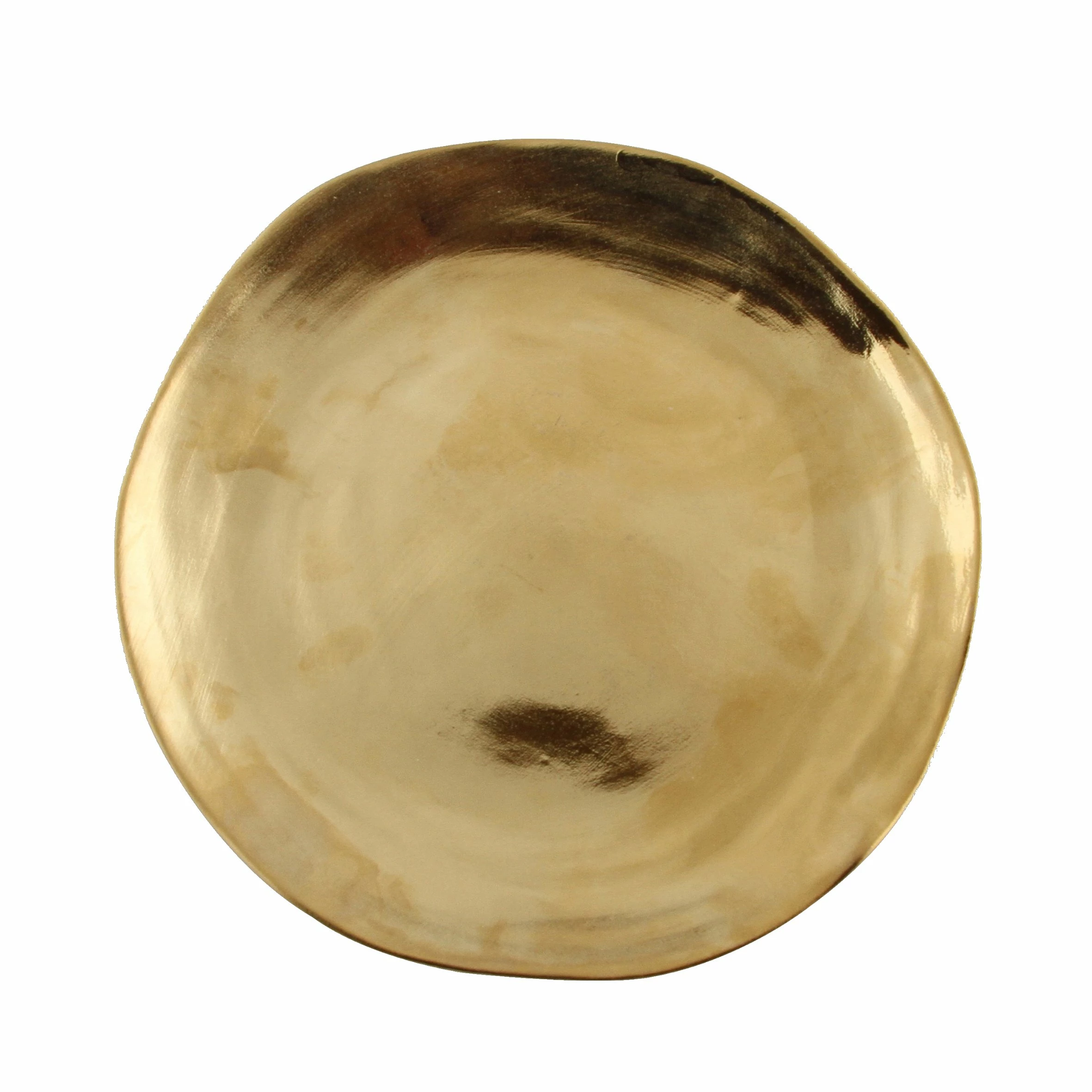 This golden set of imperfect plates will be a eye-catcher on your dinner table. The plates are made by hand which gives the plates an unique look. Made of porcelain and dishwasher safe but not suitable for microwave. 3 different sized plates boxed.