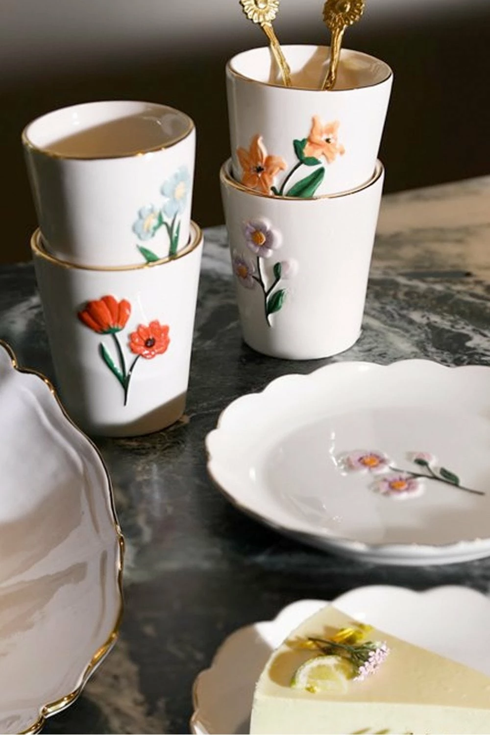 Plates Set of 4 White Single flower design Dolomite 2 x 17cm Perfect for a slice of cake with afternoon tea Each hand-painted Touch of gold Four different flowers