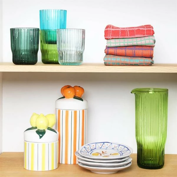 Use this cheerful jar for organizing little items in your living room or kitchen. This design with colourful stripes and fruity lid make sure all your items stay safe inside. The jar is also available in a bigger size. Material: Dolomite Colour: Multicolour Size: 16 x 10cm