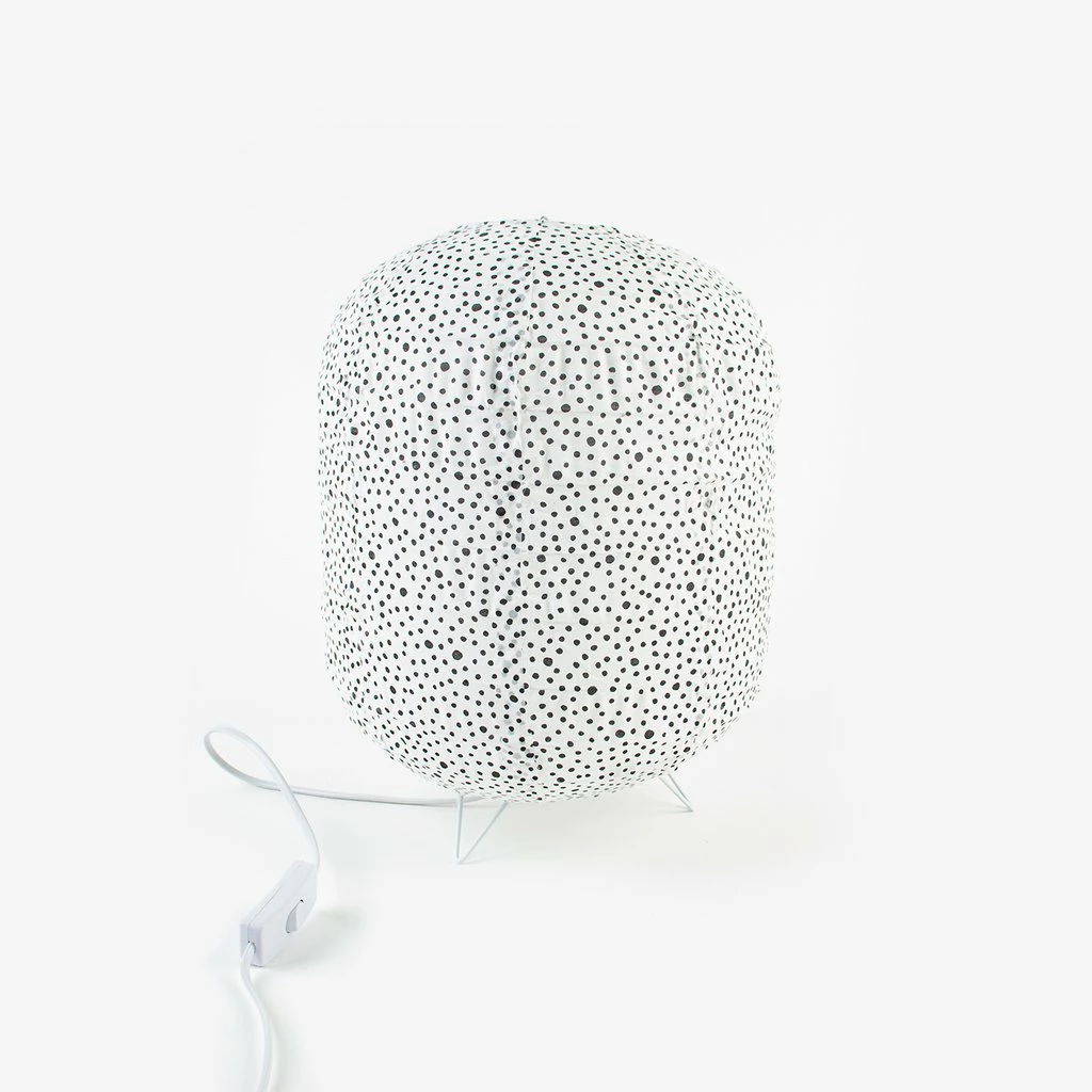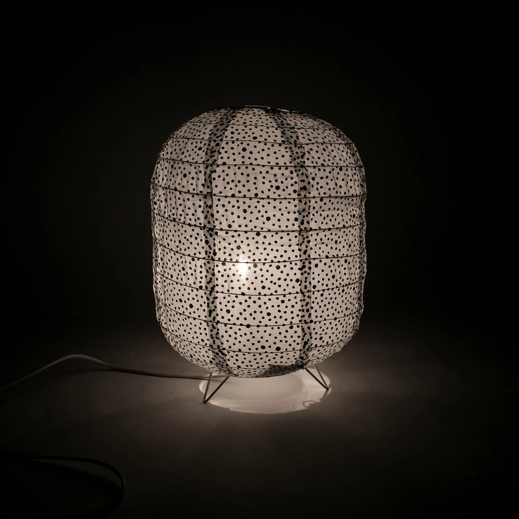 This small white lamp with black polka dots is designed to give a nice cozy atmosphere to the living room or bedroom. Made of printed cotton canvas, it is easy to assemble and reminds of Japanese lanterns.