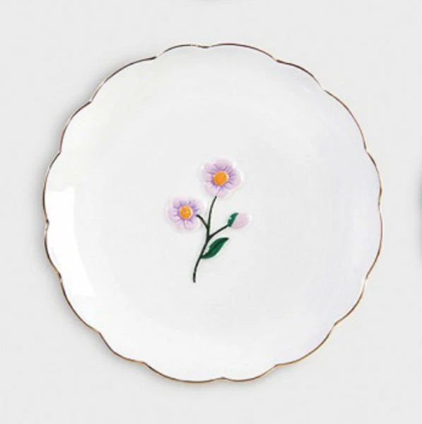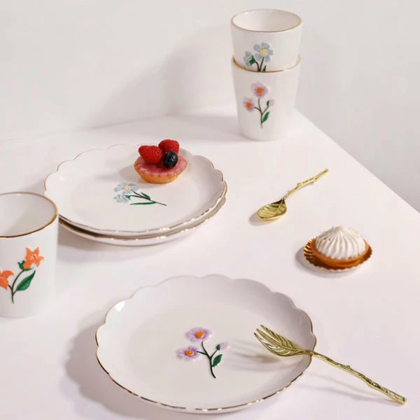 Cake will taste even better from these beautiful plates. Each hand-painted plate shows a different wildflowers and is finished with a touch of gold. Choose from 4 designs: Red poppy, Blue forget me not, lilac flower, and Orange lily. Material: Dolomite Colour: Multicolour Size: 2 x Ø 17 cm